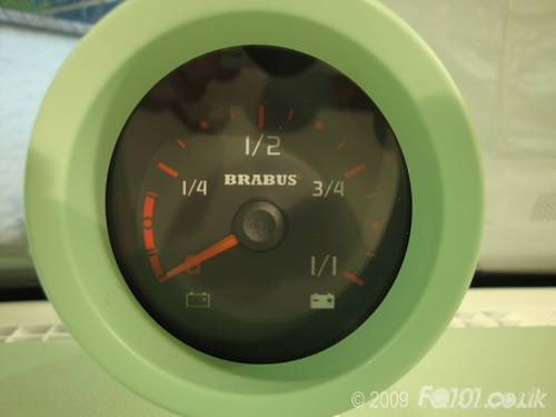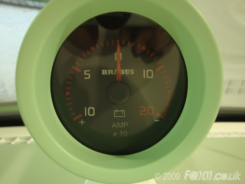 Both pods contain new dials. The left hand pod shows the realtime current draw. The needle is centred at zero. When pulling away, the car will draw the most current and the needle will move to the left. Upon braking or slowing down, the regenerative system will top up the battery and so the needle will move to the right.
