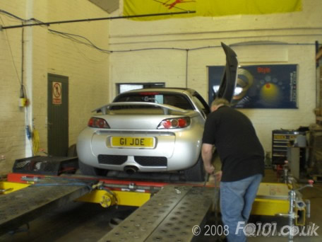 The guys at Red Dot strapped the cars securely to the rollers in turn, KiRSty going first in her 45kW fortwo...