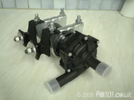 The picture below showing the installation of the oil cooler and charge cooler radiators; the second picture is displaying our charge cooler's high flow pump with our custom mounts and rubber supports.