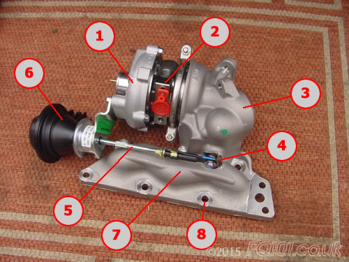 The following image shows a complete turbo assembly as purchased from smart. This particular model is a 60kW unit which is found as standard on the Roadsters (not Brabus) and the Brabus fortwo 450s. The numbered components are as follows: