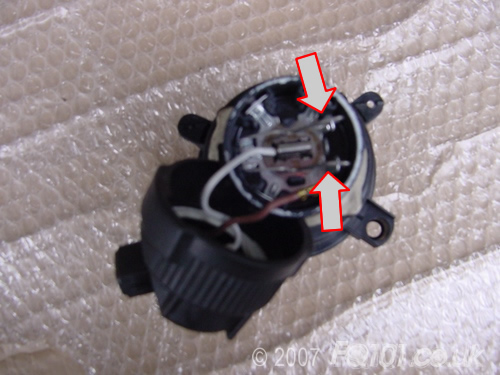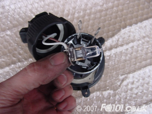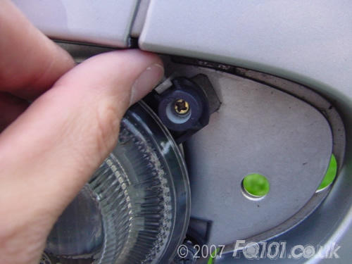 Unplug the connector at the rear by squeezing the metal clips together. Remove the light assembly from the car.