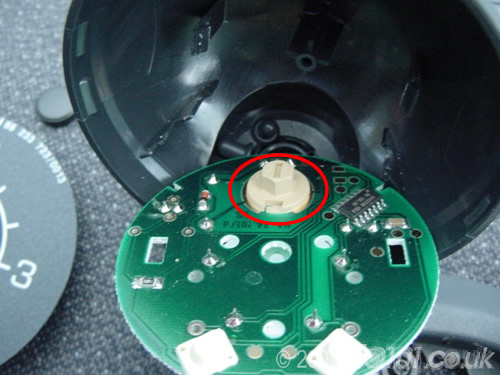 For the rev counter, start the car after ensuring that it is safe to do so. Then switch off. The rev counter motor will be reset to the zero position. Carefully put the needle back on without rotating the spindle ensuring that it points directly to zero. This may be tricky at first and may require several attempts.