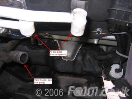 The water transfer pipes are secured via Jubilee clips; the fuel lines are slide clips (blue in the picture, as standard they are black), and the air-con pipes are attached via a T40 torx bit. Please remember to de-gas the system correctly.