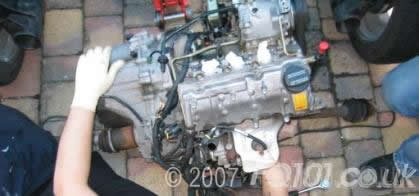 With the weight taken on a jack at the back of the engine (as was removed), gently roll the engine under the back of the car. You may need to lower the engine slightly to ensure it can clear the back of the trid.