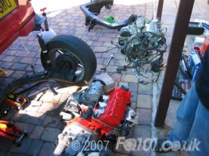 Carefully wheel the engine out, it's a very close fit and you have to manipulate the rear arches as the suspension assembly moves. Ensure there are no further hoses/cables/wires attached to the car, and the whole sub-frame/chassis arrangement should now be free.