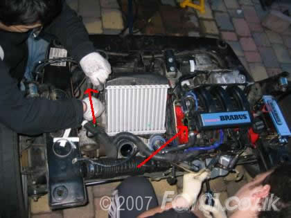 To remove the intercooler pipes, undo the jubilee clips from the top pipe - there is one jubilee each end, one on the intercooler and the other at the throttle body.