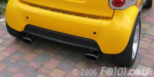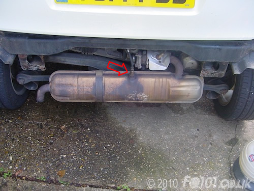 Looking at the back of the car, you will see that the exhaust system is fully accessible. Note, if you have a mk1-3 fortwo 450, you won't have a lambda sensor in the top of the exhaust. This is sensor is shown arrowed in the following picture:
