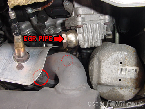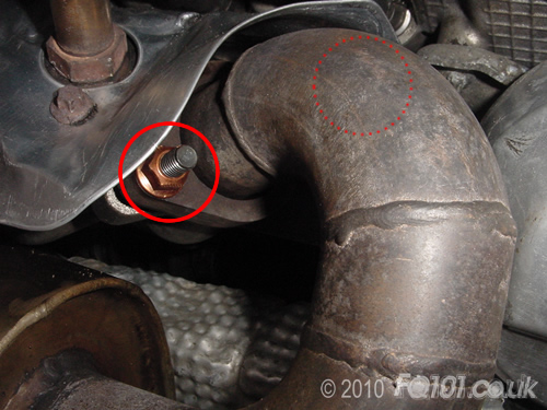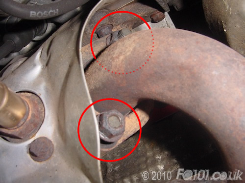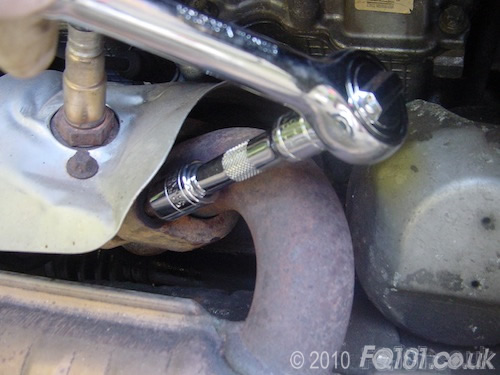 Carefully undo both nuts with your socket set. Be careful when you do this as the studs are prone to snapping off in the turbo manifold. If you think you need to apply excessive force to get the nut to move, try soaking the nut and stud in Plusgas (or similar). This is a highly effective penetrating fluid that should ease stubborn nuts. However, for reasons explained later, this might not work! If the stud comes out of the turbo, don't worry as we will be replacing these later.