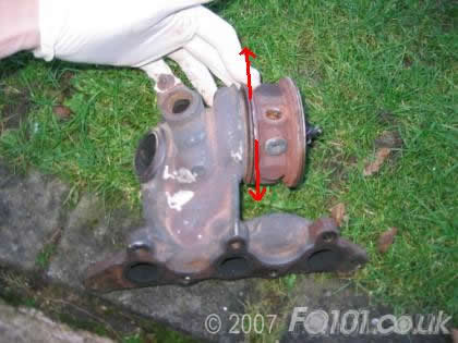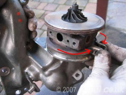 Note (and mark if you like) the position of the turbo relative to the manifold. There is a convenient casting mark which points to the centre of the oil feed hole.