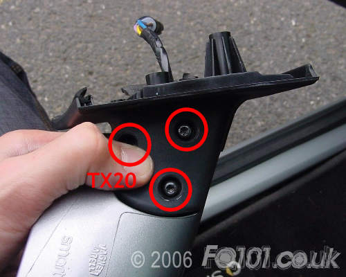 Replace the supporting frames first with the silver TX20 screws. Then fix the electric wing mirror motors where the manual ones were. Feed the cable through the mirror and out underneath.