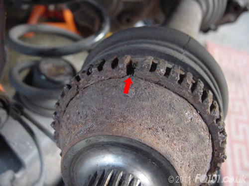 These are where problems are common. The rings are located on the rear driveshafts before they connect with the wheel hubs. They are very exposed to the elements and unfortunately weren't made of high quality material. In the following image, we have disconnected a driveshaft from the hub to show the extent of corrosion. You can see a clear brake where rust has built up under the ring and forced it to split. This will be transmitting an irregular speed to the controller as the car is moving causing the ABS light to come on constantly.