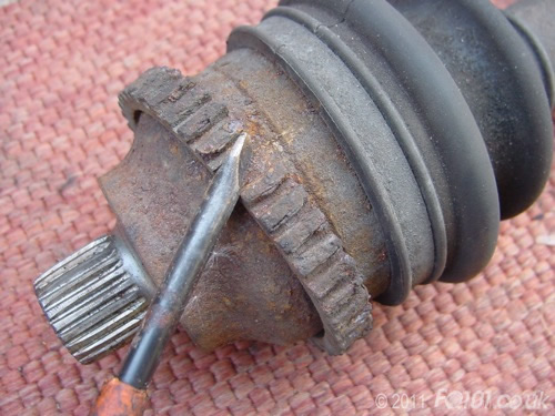 Now that the ABS ring has cracked, it will remove from the drive shaft fairly easily. We found that forcing it open at shown broke any persistant rust patches.