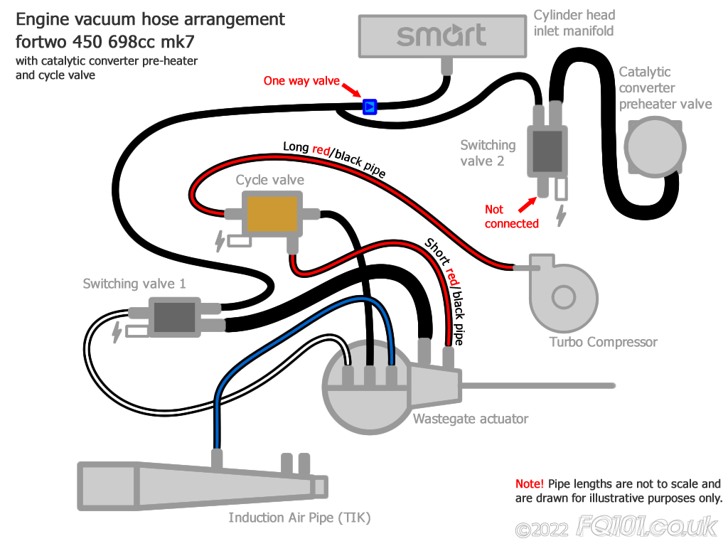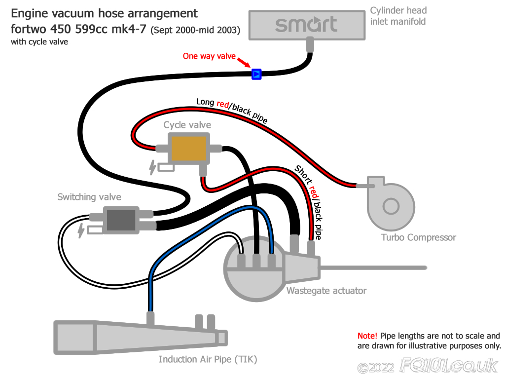 If you have replaced any part of the turbo control system, you will have probably disconnected the vacuum/boost pipes. However, it is not easy to remember which pipe goes where. The following diagrams show the arrangement across all variants of the city-coupe, city-cabrio and fortwo 450.