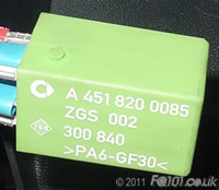 The core element to the heated seat control system, is the relay module. The fortwo 450 and Roadster heated seats have similar shaped modules but require one module per seat. The fortwo 451 only requires one module for both seats and therefore operates differently to the other cars. Therefore, if you are sourcing components, you can only use the bright green fortwo 451 module which looks as follows: