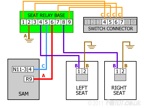 - The relay module requires a constant live. This is taken from expansion slot R9 on the front of the SAM. This allows the heated seat buttons to be pressed when the key is at position '1' and stops the relay voltage from floating when the engine is off.