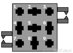 With the connector removed, turn it so that you can see the numbers '1' and '9'. Their locations are indicated approximately by the white numbers below. The controls for heated seats need to be wired into positions 4, 5, 6 and 7, shown in red. These connectors are Tyco AMP and you can buy the inserts from many electronics distributor (Maplin's for example). Alternatively, you can harvest them off an old wiring loom with a sufficient length of wire attached.