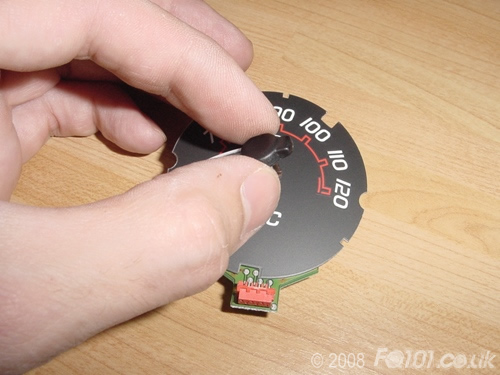 Starting with the boost gauge, remove all LED's from the PCB by gently heating the tabs at the base of the LEDs. If you want to keep a red needle, then leave LED 4 in place.