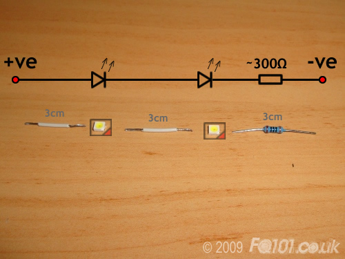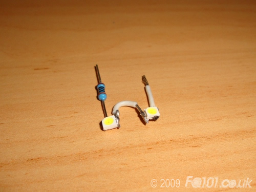 In addition to two LEDs, you will need an appropriate resistor and two short pieces of wire. Most SMD LEDs draw 20mA but vary in voltage accross the LED. This will determine your resistor size. If you are unsure of what resistor you should use, then please contact us. Here are a list of possible options: