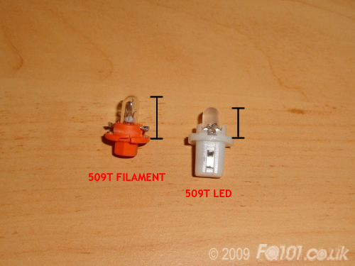 The source of the backlight to the heater / fan sliders is from a 509T bulb located under the safety triangle. You could replace this bulb with a coloured LED 509T, but the LED head is much shorter than the filament bulb.