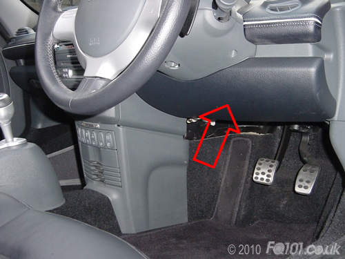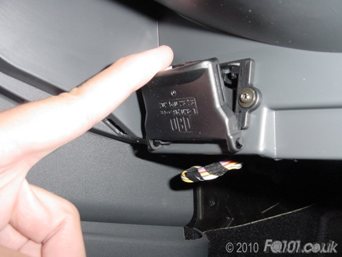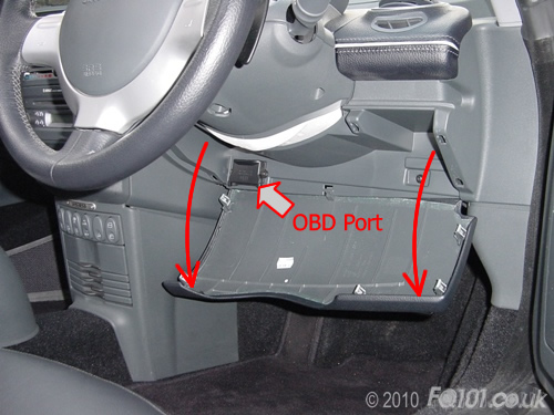 The cover pulls down from the top edge and hinges down on the bottom edge. You can remove the cover completely for ease of access. The arrow points to the location of the OBD port.
