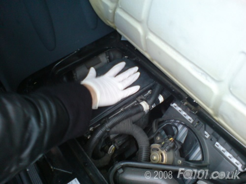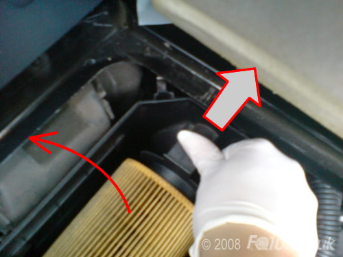 To remove the existing filter, slide the retaining arm back as shown below. Push the filter towards the back of the airbox and lift it free of the car.