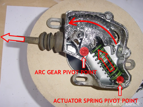 As the arc gear turns, the force of the actuator spring no longer acting towards the arc pivot point and it can assist in turning the arc gear. This is useful as the motor alone does not have enough force to push the clutch release arm.