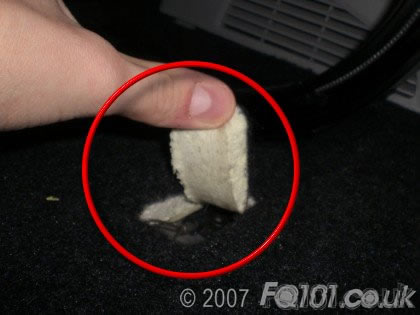 Behind the passenger seat there is a small flap cut in the material of the carpet.