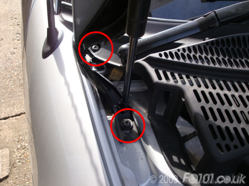 Open the bonnet. You will see the other bolt that holds the bonnet lid in place. This is circled in the foreground with the previously revealed one circled in the background. Be careful as you undo this second set of bolts as the whole bonnet will become loose.
