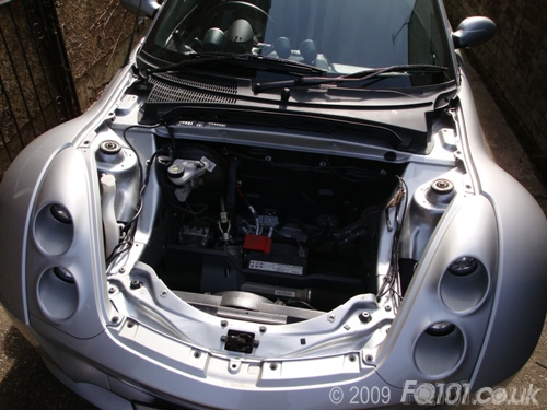With the bonnet closed, you will see two black screw caps at either end of the scuttle, circled below. Use a very fine tool to pop them off. The plastic marks very easily so be very careful as any damage will be quite noticable. If you choose to sacrifice your caps, or have lost them, then they can bee reordered from smart under the following part number: