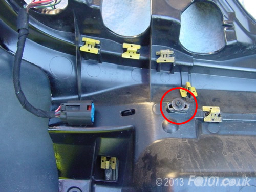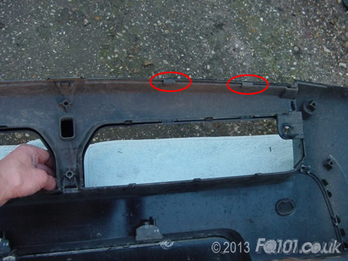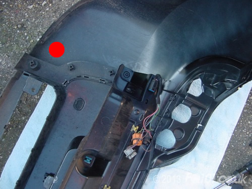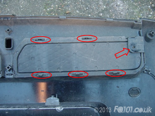 With the inserts removed, the outer panel of the lower section can be removed. Push down as shown and unhook it from the inner trim where circled. Again, this is fiddly and may take a few attempts. Sadly, there is not much flex in the plastic!