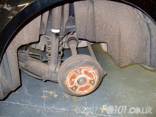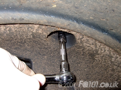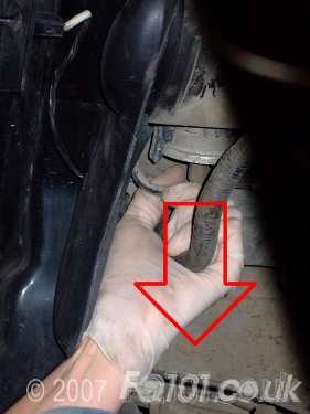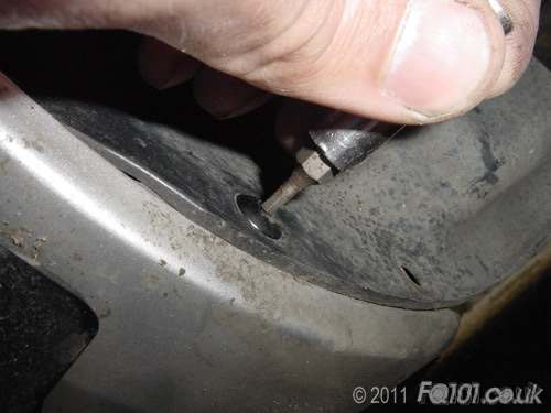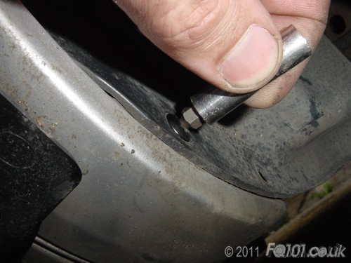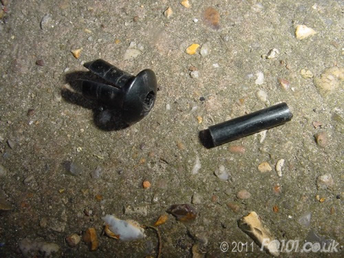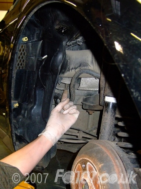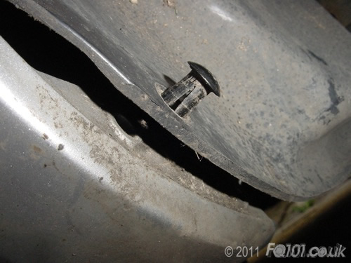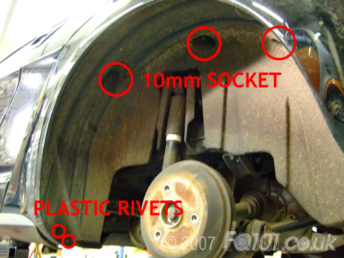 To remove the wheel arch lining, you need to remove the 3 plastic nuts and 3 plastic rivets holding it in. The nuts and two of the plastic rivets are shown below: