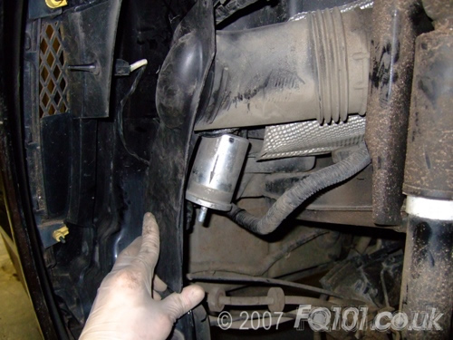 Pull the filter out of its cradle and disconnect the rear pipe. There is enough slack on the pipe to do this if you haven't removed the air duct. The resistance you feel will be the lip on the filter fouling on the cradle and not the pipe stretching beyond its limit.