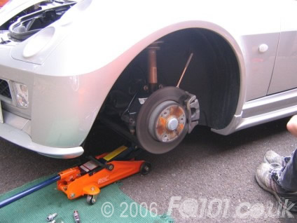 Locate the jack under a safe point of the car. Either use the jacking point or if your car is too low, locate the jack under the front wishbone!