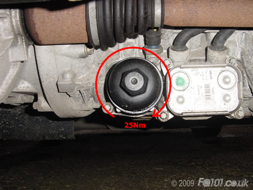 Tighten the filter to 25Nm. Wipe off any excess oil that might have seeped out during tightening.